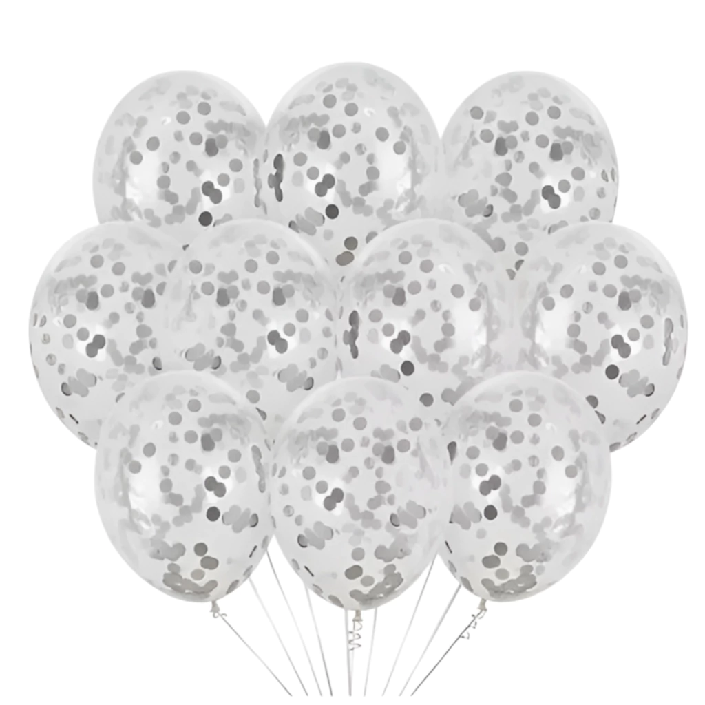 Características principales: - Tamaño: 10 pulgadas. - Confetti plateado decorativo. - Paquete con 10 unidades. - Resistencia y calidad garantizadas.